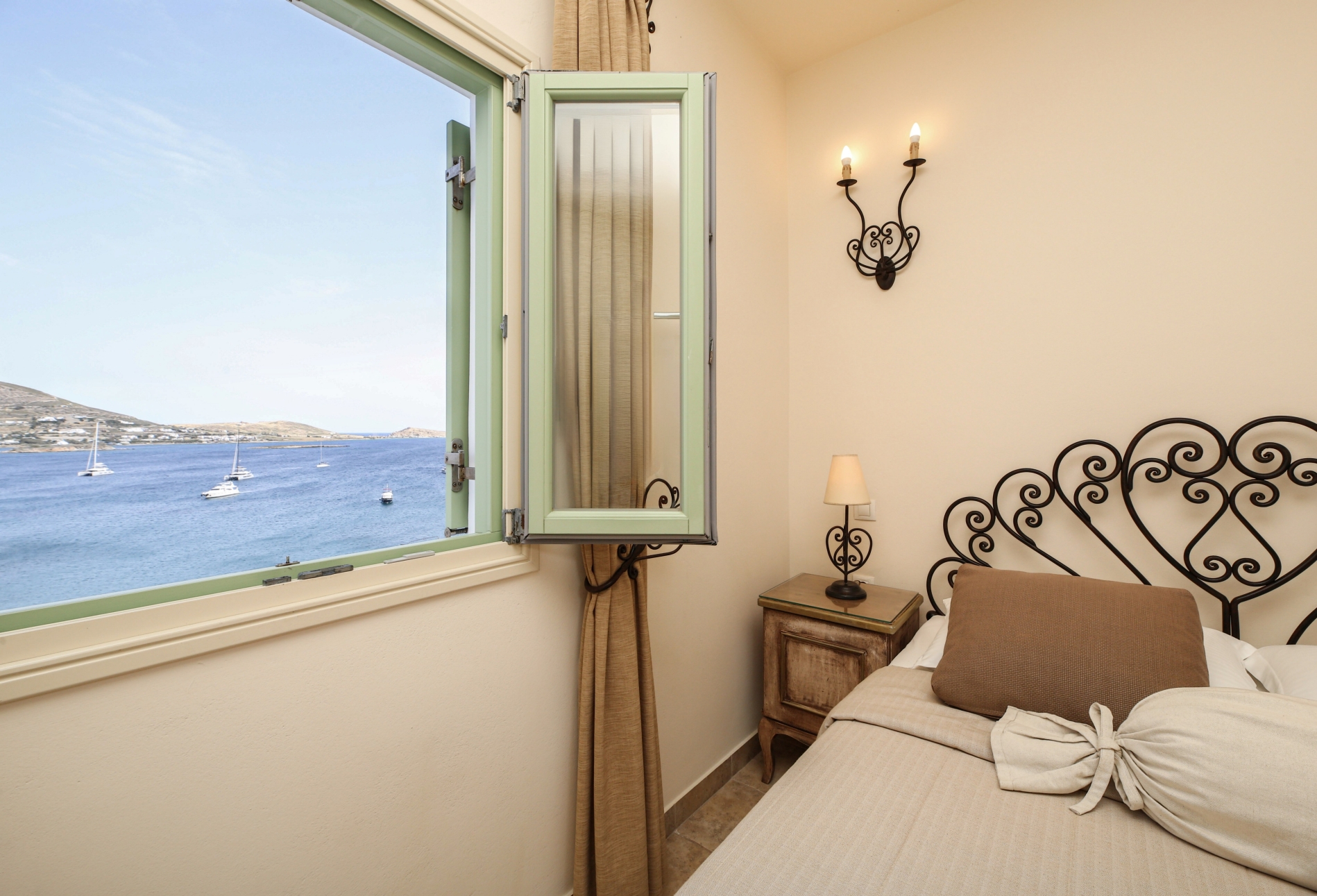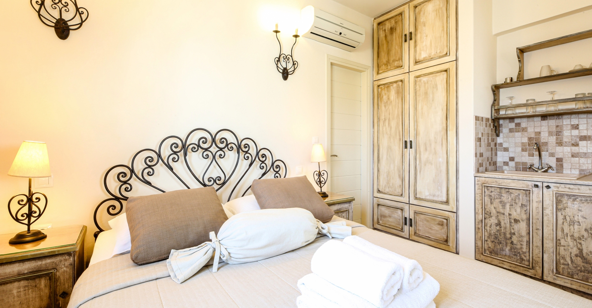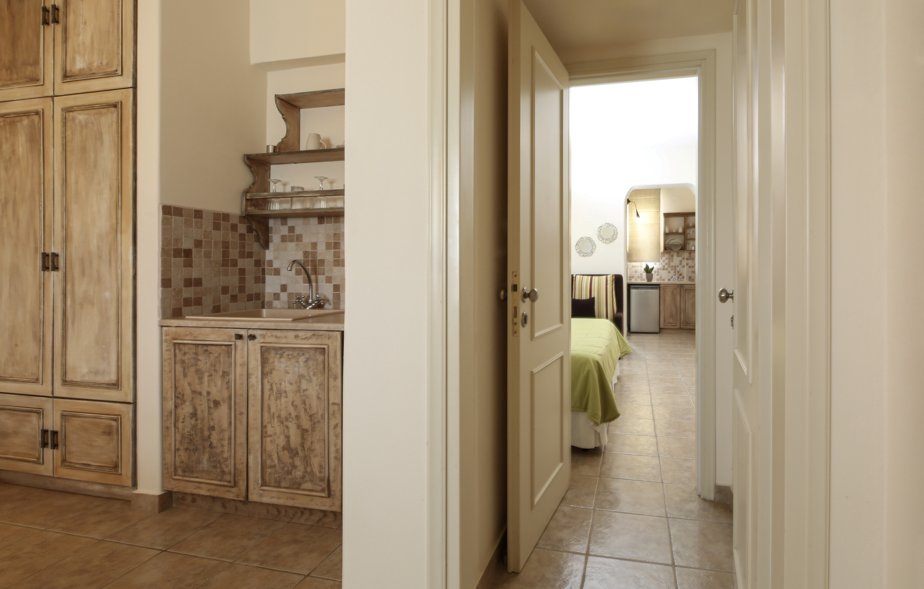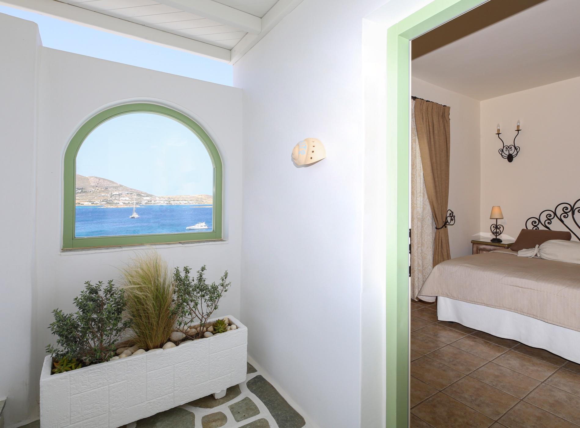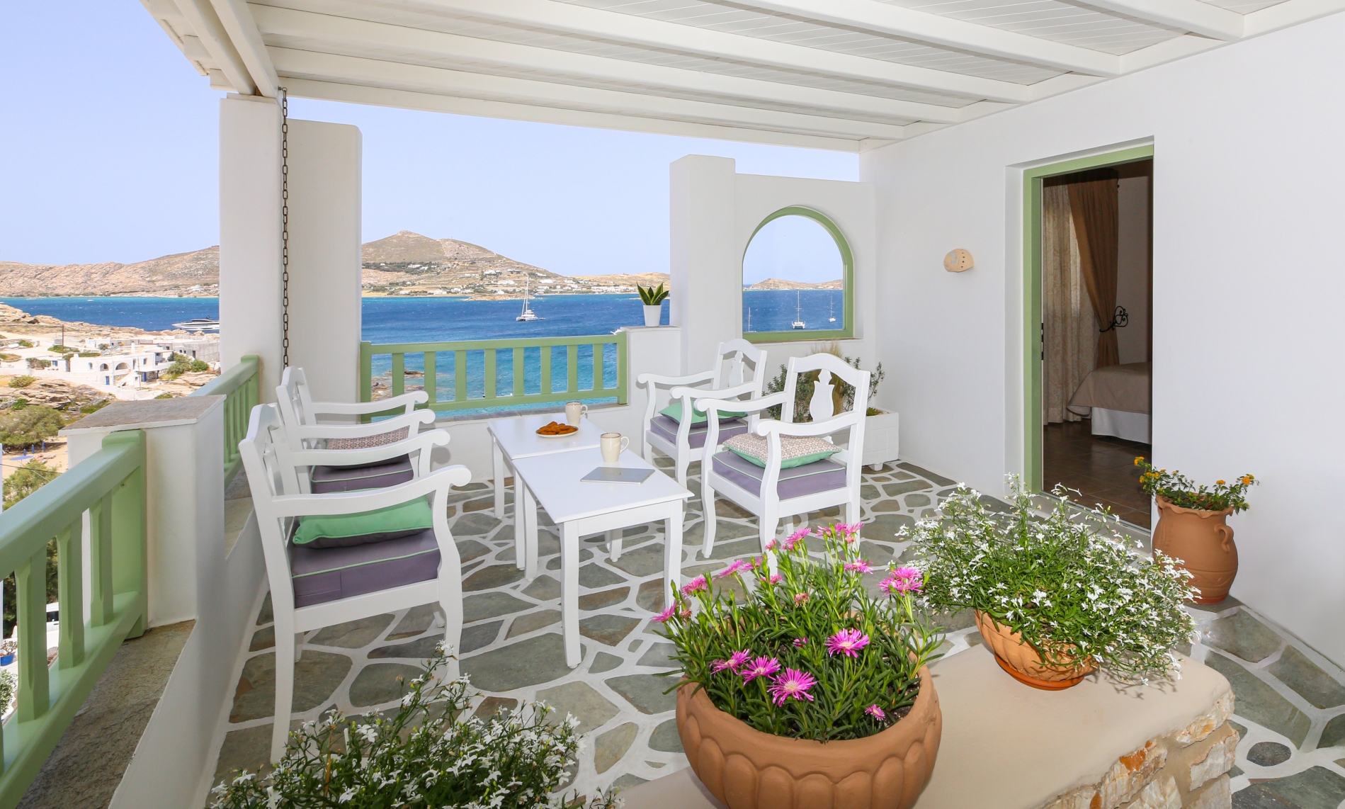 The Family sea view studio with a big personal terrace with sea view,is ideal for families.It is consisted of Two, furnished studios with two private bathrooms and a connecting corridor.