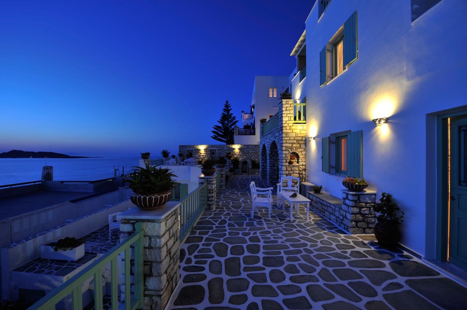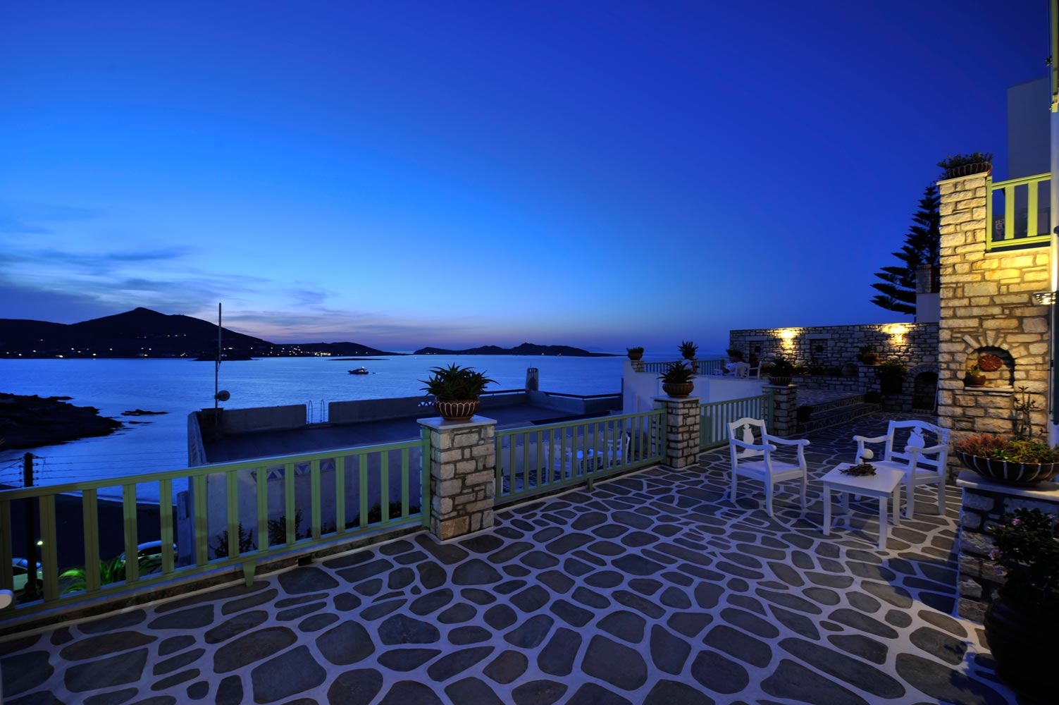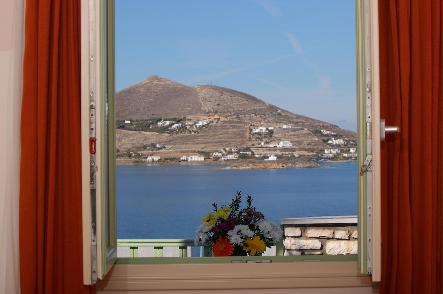 Με διακόσμηση σε ζεστούς γήινους τόνους, αυτό το δωμάτιο διαθέτει βεράντα με θέα στη θάλασσα και παράθυρο.